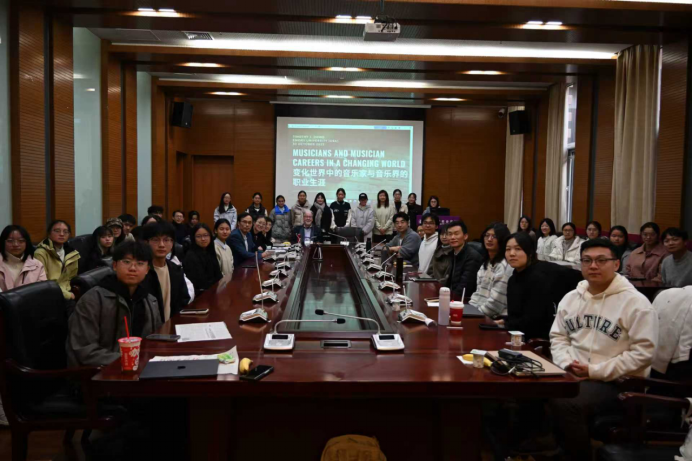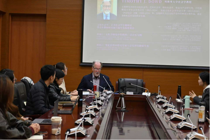 第三项活动是由Dowd教授主讲,题目为“变化世界中的音乐家与音乐界的职业生涯(Musicians and Music Careers in a Changing World)”的讲座,于10月30日中午12:10-13:50在bwin官网144会议室举行。讲座由bwin官网社会学系系主任王庆明教授主持。王琰教授、秘舒副教授、张龙副教授、于佳煖讲师、陈柙兵助理研究员、许又姜宇博士等师生出席。